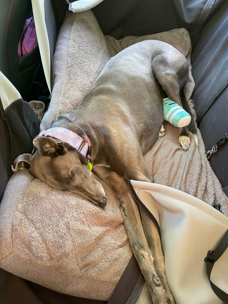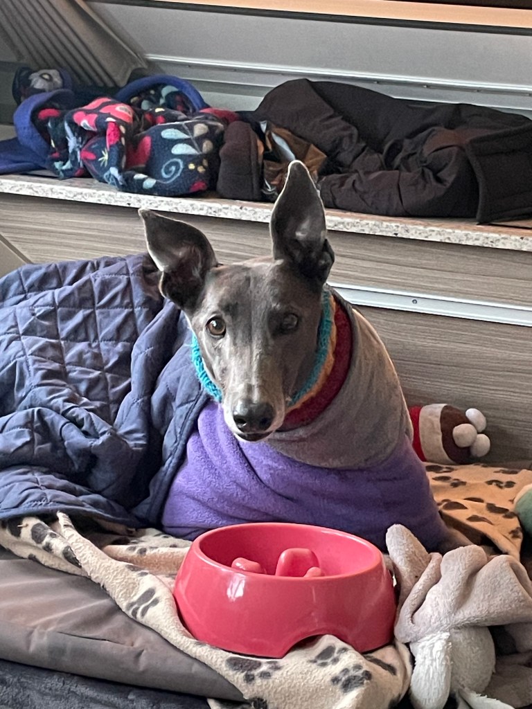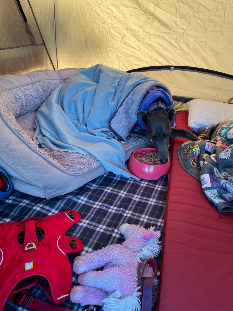 In late 2023, Taylor and I had a few nights in a cabin in a caravan park in Paringa, South Australia. It wasn’t planned – I’d planned to be elsewhere camping in our tent – however a big storm was forecast and the weather was very hot, so we were lucky to find an available dog-friendly cabin at short notice. On one of our walks around the park we found out a greyhound was staying in the cabin next to us for the next two nights! Later that night as I took Taylor out for a bedtime wee, we ran into the dog’s owner. He mentioned that his greyhound was struggling to settle – it was the first time he’d ever taken him away. I offered to lend him a lickimat and some peanut butter to help calm his hound, to which the man replied “thanks but he’s got his toys. I don’t think we’ll be staying another night”, and they packed up and left the next day. I really felt for both of them – if it was the first time they’d ever been away, of course he might have trouble settling at night.