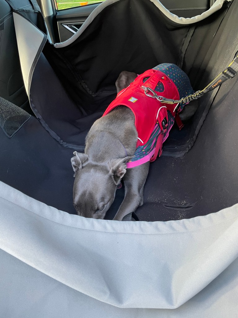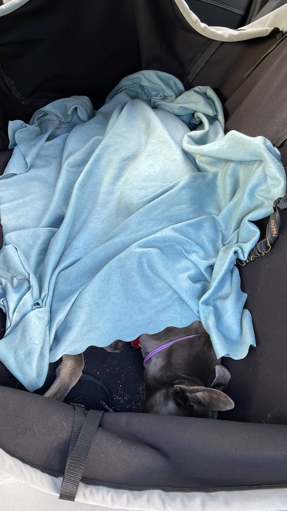 I tried to get her into her bed which was set up in the tent, however she wanted to get in the car. I’ve learnt that the car has become her safe space when we’re away on a trip (which makes me happy as that means she’s not sick of the car after our road trips!) so I popped her in the car and left the windows down. She stayed in there for quite some time and I just kept checking on her, reassuring her that she was ok and wrapping her up in a blankie as the evening started to cool. I let her decide when she was comfortable to get out, which was when she stood up when I went to check on her and she was clearly wanting to get out of the car at that point.